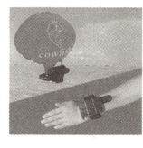 22. (8分)市面上有一种防溺水手环,如图所示,将手环系在手臂上,紧急情况下打开手环,手环内气瓶中的二氧化碳会迅速充满气囊,最终使人漂浮于水面。为确保安全,人体浸入水中体积不能超过人体总体积的五分之四。已知某运动员的质量$m_{人}=51$ kg,平均密度$\rho_{人}=1.02×10^{3}$ kg/m³,水的密度$\rho_{水}=1.0×10^{3}$ kg/m³,$g$取10 N/kg,忽略手环体积和自重,求: