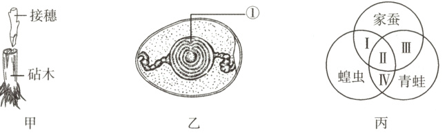 A [解析]嫁接时应当使接穗和砧木的形成层紧密结合,以确保接穗成活,A正确;图乙鸟卵的结构中,胚胎发育的部位是[①]胚盘,其内含有细胞核,B错误;图丙中Ⅱ可表示有性生殖、变态发育,C错误;图丙中蝗虫的受精方式是体内受精,青蛙的受精方式是体外受精,D错误。