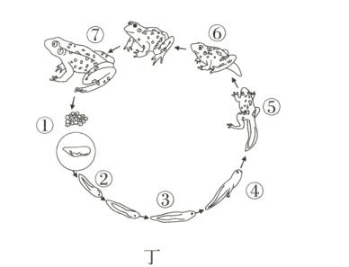 (3)图丁是青蛙个体发育过程,它的起点是[ ]_______,其幼体蝌蚪有尾,用_______呼吸,只能生活在水中;随着发育的进行,还形成了能进行气体交换的_______,并且用皮肤辅助呼吸,发育为能上陆地生活的成蛙。