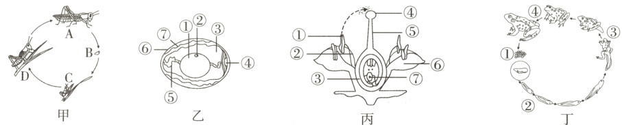 A [解析]②是胚盘,不是胎盘;图丙表示传粉;青蛙的发育类型是变态发育,不是完全变态发育。