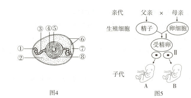 (4)图 4 为鸡卵结构图,其中为胚胎发育提供营养的结构包括________(填序号)。