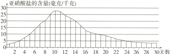 17.(滨州中考)通过乳酸发酵制作的东北酸菜酸爽可口,深受人们喜爱。我国《食品中亚硝酸盐限量卫生标准》规定,亚硝酸盐的残留量在酱腌菜中不能超过20毫克/千克。在制作酸菜的一个月内,小明同学每天取样榨汁,测量其中的亚硝酸盐含量绘制成下图,相关说法正确的是( )