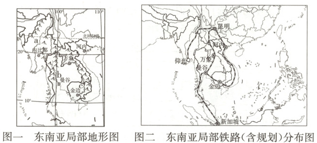 (1)结合图一和图二分析,中老铁路穿越崇山峻岭和众多水系,沿线地质、地形复杂。这是因为中南半岛上的山河分布具有______________________的特点。中老铁路两次跨过湄公河,湄公河是图一中的________(填字母)。