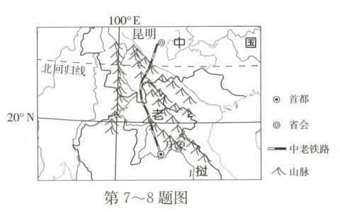 7.A [解析]读图可知,图示区域地形以山地、高原为主;该区域大部分位于北回归线以南,属于热带;该区域以热带季风气候为主,全年高温,降水分旱、雨两季,河流流量季节变化大;中老铁路从中国直接到达老挝,不经过越南。故选A。