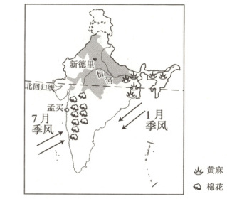 @@12.D [解析]印度的主要粮食作物是水稻和小麦;图中阴影部分是小麦种植区,水稻主要分布在恒河中下游和半岛沿海地区;孟买靠近棉花产地且沿海,宜建棉纺织工业中心。故选D。