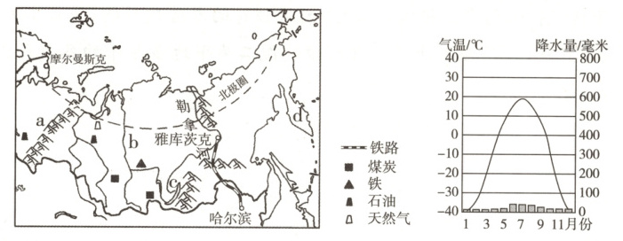 雅库茨克位于勒拿河沿岸,是俄罗斯著名的内河港口,可以直航北冰洋。俄罗斯为了加强和我国的经济贸易往来,计划修建由雅库茨克纵向连通我国东北的铁路线。左图为俄罗斯部分地区示意图,右图为雅库茨克气候资料图。读图,回答18~20题。