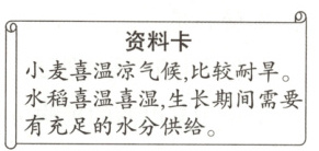 (3)参照以上学习案例,结合右面资料卡中的信息,判读图二中小麦、水稻的分布区,并将其图例补充到图二中的方框内。