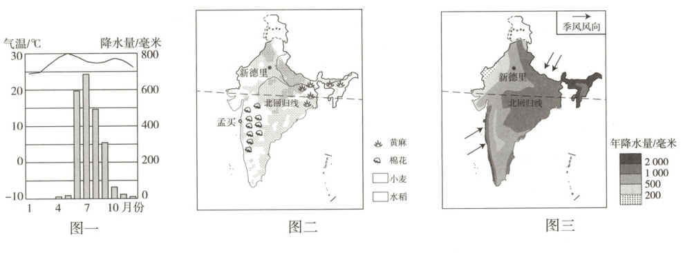 ### 23. 根据老师提供的孟买多年平均各月气温和降水量图(图一)、印度农作物分布图(图二)、印度主要风向和年降水量分布图(图三),某学习小组开展了主题为“热带季风气候对印度农业生产的影响”的学习活动,请帮助该小组回答下列问题。(10分)