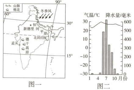 材料三 图一是印度地理位置示意图,图二为印度主要气候资料图。