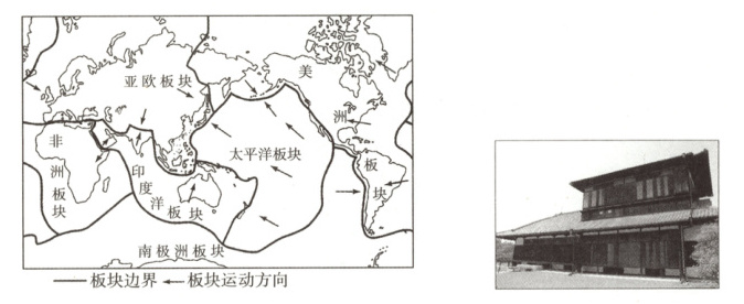 (滨州中考)日本平均每天发生约5次有感地震。作为一个地震频发的国家,传统建筑在建造时会考虑到抗震因素。读六大板块分布示意图和日本传统建筑景观图,回答5 - 6题。