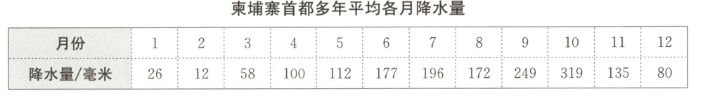 下图示意柬埔寨首都多年的年降水量统计。
