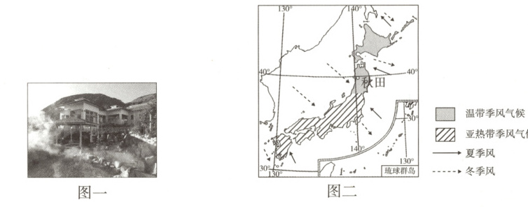 材料二 图一是日本秋田市某温泉建筑,图二是日本气候类型分布图。