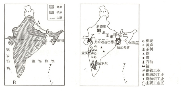 (1) 地理位置:印度的地理位置可概括为“北山、南洋、东湾、西海”。其中,“北山”是指A______山脉,“南洋”是指B______洋。