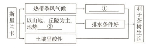 (2) 茶树适宜生长在温度20℃ - 25℃、年降水量1000毫米以上、地形排水良好的砂质酸性土壤地区。斯里兰卡是世界重要的红茶生产国。据此完成下面框图。