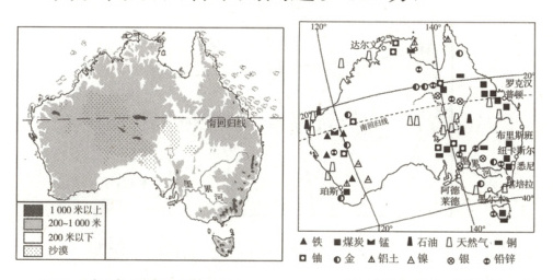 19. 读澳大利亚地形示意图、澳大利亚矿产和城市分布图,回答下列问题。(10分)
