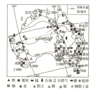 17.D [解析]根据所学知识读图可知,这里发展了绵羊| 小麦混合经营农业;图文材料没有反映出澳大利亚的动植物古老澳大利亚畜牧业发达,图文材料体现出该地养羊业发达18.C[解析]读图可知,澳大利亚的铁铁矿资源主要分布布在西部地区,煤炭资源主要分布在东部地区,所以铁矿和煤炭资源分布区的位置相距遥远, ①正确;钢铁工业中心煤炭资源丰富,②错误;钢铁工业中心分布的东部地区,气候湿润,淡水资源丰富错误;澳大利亚地广 人稀,劳动力短缺,④正确。 故选C