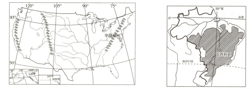 11.A [解析]美国本土和巴西均东临大西洋,A项正确;美国密西西比河自北向南注入墨西哥湾,B项错误;美国本土地势东西高,中部低,巴西地势南高北低(或:西北低,东南高),C项错误;美国本土绝大部分位于北温带,境内没有热带雨林分布,D项错误。故选A。12.B [解析]美国本土东北部五大湖地区经济发达,人口稠密,巴西东南部气候适宜,交通便利,人口和城市密集,A项错误;美国最大的城市为纽约,首都为华盛顿,巴西最大的城市为圣保罗,首都为巴西利亚,两国首都都不是本国最大城市,B项正确;美国属于发达国家,巴西属于发展中国家,C项错误;咖啡豆、可可属于热带农产品,美国主要位于北温带,不盛产热带农产品,D项错误。故选B。