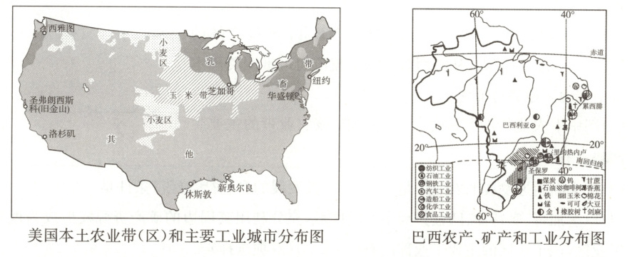 (3)第二次世界大战之后,巴西工业化步伐加快,从“巴西农产、矿产和工业分布图”中可以看出,巴西工业分布与原材料(农矿产品)的关系是______________________。