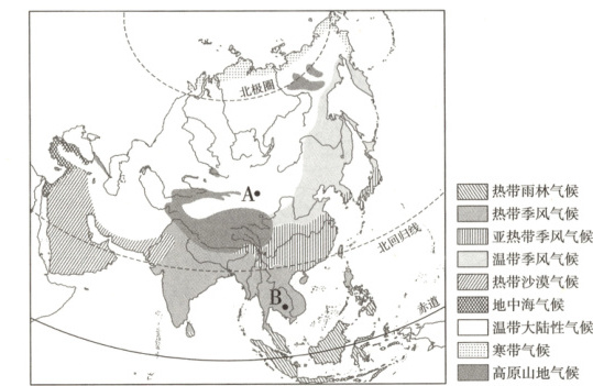 中国敦煌的A遗迹和柬埔寨的B遗迹是两处世界著名的历史文化遗迹。读亚洲的气候类型分布图,回答7~9题。