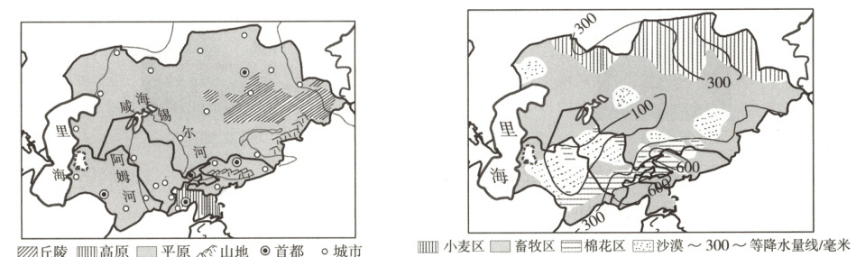 读中亚地区地形简图和中亚地区农业分布示意图,回答10~11题。