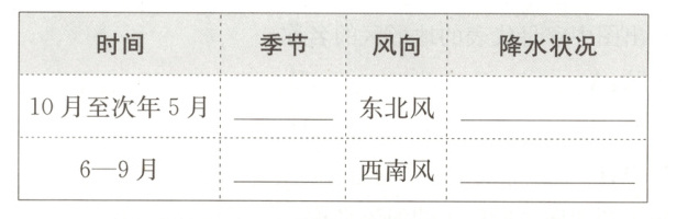 1. 热带季风 终年高温,降水分旱、雨两季 2. (自左往右,自上而下)旱季 降水少 雨季 降水多 3. 西南 水旱