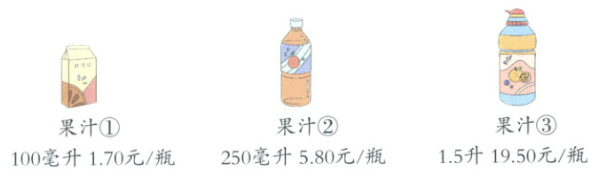 100毫升=0.1升 250毫升=0.25升 ①1.70÷0.1=17(元/升) ②5.80÷0.25=23.2(元/升) ③19.50÷1.5=13(元/升) 13<17<23.2,买果汁③比较合算。