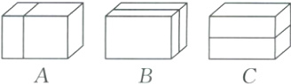9. 如下图,将一个长方体分割成两个小长方体,分别按A、B、C三种方式进行分割后,表面积分别增加了12平方厘米、24平方厘米、16平方厘米。原来这个长方体的表面积是多少平方厘米? 难点