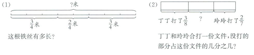 (1)$\frac{3}{4}+\frac{2}{4}+\frac{3}{4}=2$(米)(2)$1 - \frac{3}{8} - \frac{2}{7}=\frac{19}{56}$