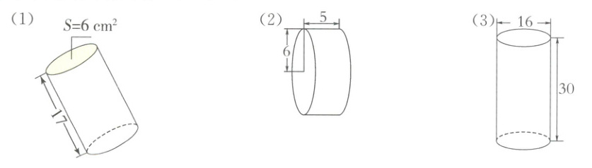 4.(1)$6\times17 = 102(cm^{3})$ (2)$3.14\times6^{2}\times5 = 565.2(cm^{3})$ (3)$3.14\times(\frac{16}{2})^{2}\times30 = 6028.8(cm^{3})$