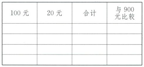 2. 小王有面额100元和20元的人民币共29张,总面值900元。两种面额的人民币各有多少张?请将下表填写完整。