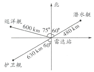 (2)巡洋舰的位置是( )偏( )( )°方向,距离雷达站( )千米。