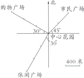 (2)购物广场在中心花园( )偏( )( )°方向( )米处。