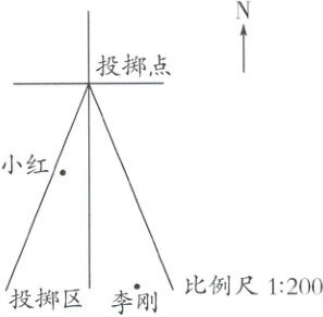 (2)李刚投在投掷点的( )偏( )方向( )米处。