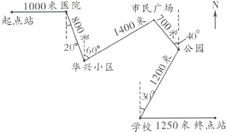 (1)从起点站向( )行( )米到医院,再由医院向( )偏( )( )°方向行( )米到华兴小区,接着再向( )偏( )( )°方向行( )米到市民广场。