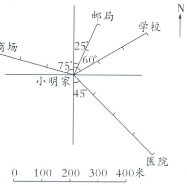(3)医院在小明家( )偏( )( )°方向( )米处。