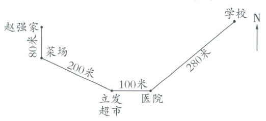 (1)赵强上学从家出发,向( )行( )米到达菜场,再向( )偏( )方向行( )米到达立发超市,继续向( )行( )米到达医院,最后向北偏( )方向行280米到达学校。