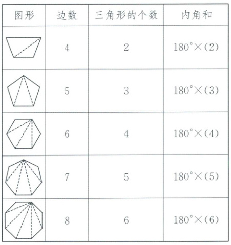 (1)我发现:求多边形的内角和时,可以运用分割法将多边形分成若干个( ),多边形所分成的三角形的个数总比多边形的边数( ),因此,多边形的内角和 = 180°×(____ - ____)。