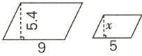 3. 把下面左边的平行四边形按比例缩小后得到右边的平行四边形,求未知数$x$。(单位:cm)