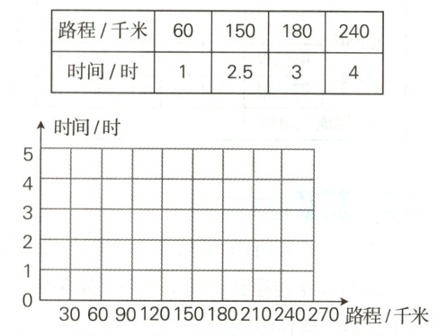2. 根据表中数据,在下图中找出行驶路程和所需时间相对应的点,再把它们依次连起来。