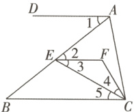 (2)因为∠DAC + ∠ACB = 180°,∠DAC = 4∠5,∠4 = ∠5,所以 4∠5 + 2∠5 + ∠ACF = 180°.因为∠ACF = 24°,所以∠5 = 26°.