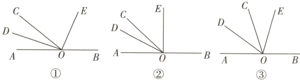 23. 12 分 14 分 新考向 探究题(烟台牟平期末)(1)如图①,点$O$为直线$AB$上任意一点,射线$OC$为任意一条射线. $OD$,$OE$分别平分$\angle AOC$和$\angle BOC$,则$\angle DOE=$_______.
