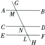9. 如图,直线AB,CD,EF被直线GH所截,交点分别为M,N,L,∠AMG=65°,CD//EF,∠ELN=65°,那么直线AB与CD平行吗?为什么?