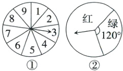 3. 图①、图②是两个可以自由转动的转盘. 图①被分成9等份,分别标有1,2,3,4,5,6,7,8,9这九个数字. 转动转盘,当转盘停止后,指针指向的数字即为转出的数字;图②被涂上红色与绿色,绿色部分的扇形圆心角度数是120°. 转动转盘,当转盘停止后,指针指向的颜色即为转出的颜色. 小明转动图①的转盘,小亮转动图②的转盘. 小颖认为:小明转出的数字小于7的概率与小亮转出的颜色是红色的概率相同. 小颖的观点正确吗?为什么?