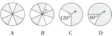 D 解析A.指针落在阴影区域内的概率是$\frac{4}{8}=\frac{1}{2}$;