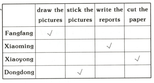 四、Fangfang和她的朋友们要一起制作海报,他们是如何分工的呢? 听短文,在表格的对应位置画“√”。(10分)