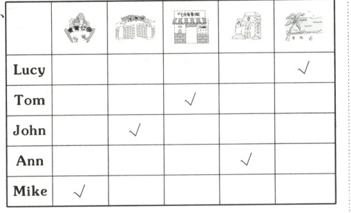 四、公交车上有五位乘客,他们的目的地分别是哪里呢?听短文,在表格的对应位置画“√”。(10分)