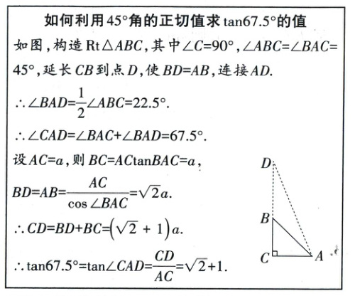 $\therefore\tan75^{\circ}=\tan\angle CAD=\frac{CD}{AC}=2+\sqrt{3}$.