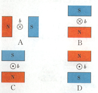 解析:通电导体在磁场中的受力方向与导体中电流的方向和磁场的方向都有关,当改变其中的一个因素时,导体的受力方向改变,而同时改变两个因素时,导体的受力方向不变.根据上述知识,与例图进行比较可知,A中b受到的磁场力方向竖直向下;B中b受到的磁场力方向水平向右;C中b受到的磁场力方向水平向左;D中b受到的磁场力方向水平向右.