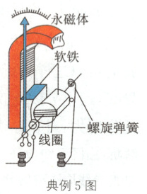 典例5 如图所示为实验室所用电流表的内部结构示意图.当电流表接入电路,有电流通过线圈时,线圈带动指针偏转.该电流表的工作原理是________________.当电流表正负接线柱接反时,电流表指针反向偏转,说明线圈的受力方向与________有关.
