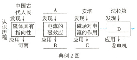 典例2 (2024·南通)小明按人类对磁的认识历程,对“电磁转换”一章知识进行梳理,图中对应位置的内容填写正确的是 ( )